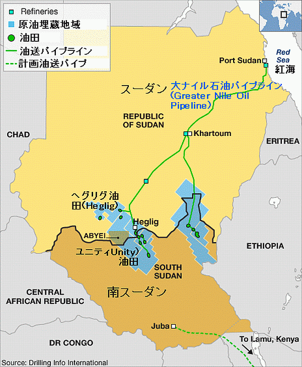 持に確信を持っているため、このような行動を取っているとみられている。リンク先を見る現在、ヘグリグの石油は中国がスーダンに投資し建設した大ナイル石油パイプライン(Greater Nile Oil Pipeline)がスーダンを通っていることから、この油田を南スーダンが奪取した場合を想定し、米企業は石油をケニアのラム港につなげる石油パイプライン(緑色の点線ライン)の建設について検討に入っている。しかし、そ