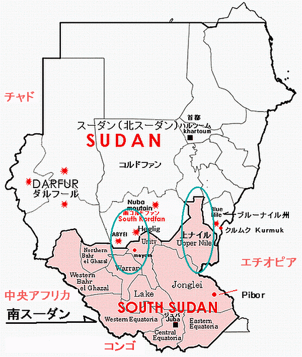 地図で見れは、国境付近には、国境をまたいで油田地帯(青い楕円)があり、またここは、以前からこの地域に住む部族がスーダンの開発に反発し武力闘争を行い、SPLM-Nなど反スーダン組織も加わり双方に多数の死傷者をだしている地域でもある。過去ブログ:30万人が飢餓の可能性 スーダン紛争 スーダンでSPLM-Nが中国人拉致、一部開放 次の「アラブの春」はスーダン? 自衛隊派遣予定の南スーダンで軍事衝突