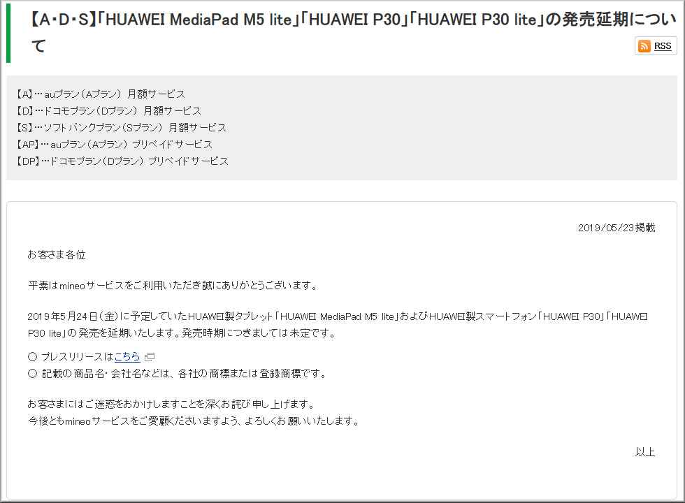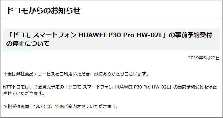 日本国内の移動体通信事業者(MNO)や仮想移動体通信事業者(MVNO)サービス各社から発売が予定されていた「HIAWEI P30 Pro/P30/P30 lite」などのスマートフォン(スマホ)については、NTTドコモ、au、ソフトバンク、楽天モバイル、LINEモバイル、mineoなど、主要な通信キャリアの多くが発売延期や事前予約の停止などを告知しています。