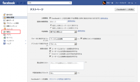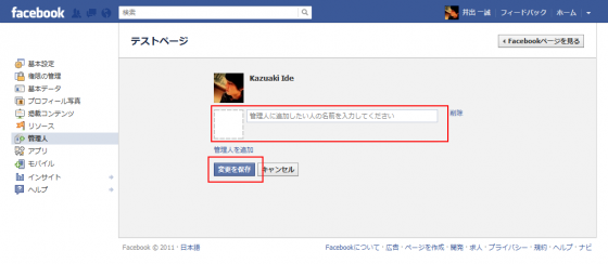 恐らく皆さんが作成するFacebookページは、複数人で運営する事になるでしょう。最初に他のメンバーも管理画面に入れるように、ここで管理人の追加をします。以下より管理画面にいる場合を想定した流れを説明します。管理画面に行くにはこちらを参照して下さい。