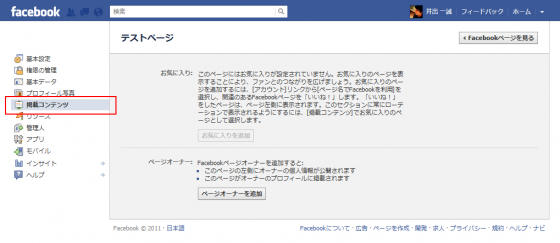 画像を見る「掲載コンテンツ」では、Facebookページの左下に表示される「お気に入り」「ページオーナー」の登録を出来ます。