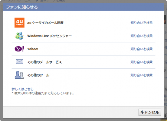 「au」「Windows Live メッセンジャー」「Yahoo!」などのメールサービスに登録しているメールアドレスをインポートして、Facebook上から送信します。