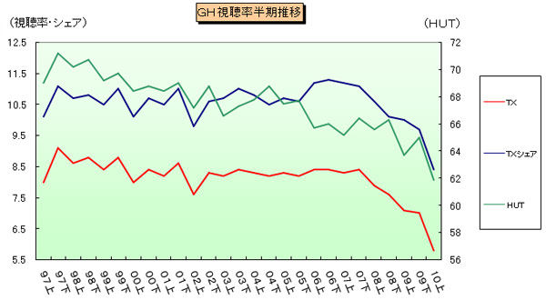 実際、テレビ離れがいよいよ加速し始めたようです。グラフはテレビ東京のメディアデータから引用したものですが、緑色の線のHUTを注目してください。HUTとは「どのくらいの世帯がテレビ放送を放送と同時に視聴していたのかという割合」(ビデオリサーチ)ですが、長期的に下降傾向をたどっています。そのHUTが2010年上期に急激に落ちたことがわかります。