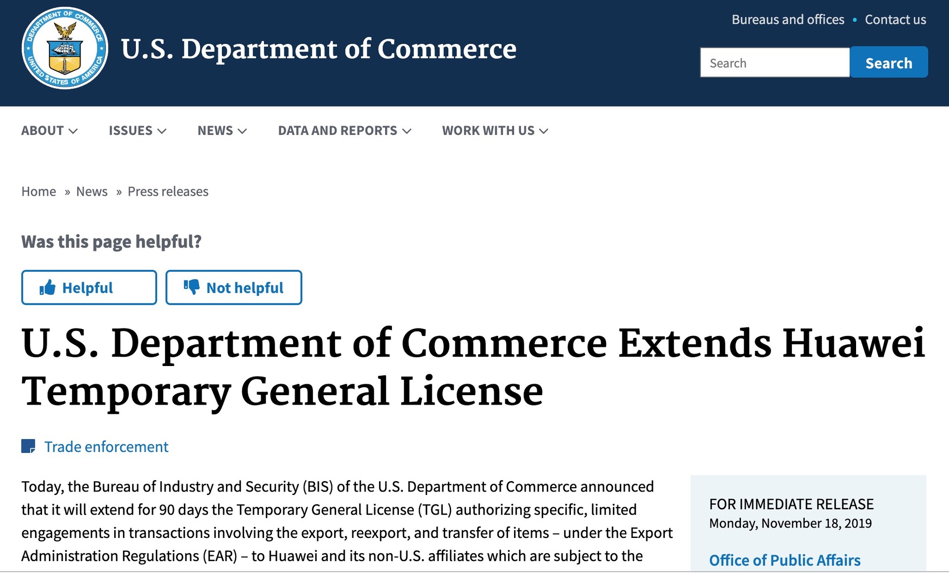 いわゆるアメリカのファーウェイに対する制裁による「ファーウェイ問題」における猶予期間で、これによってこれまで米国企業がファーウェイへの輸出を含む同社との取引について限定的に期間限定で承認する猶予が与えられていましたが、今年8月の90日感延長に続いてさらに90日間延長されて2020年2月16日(日)までとしました。