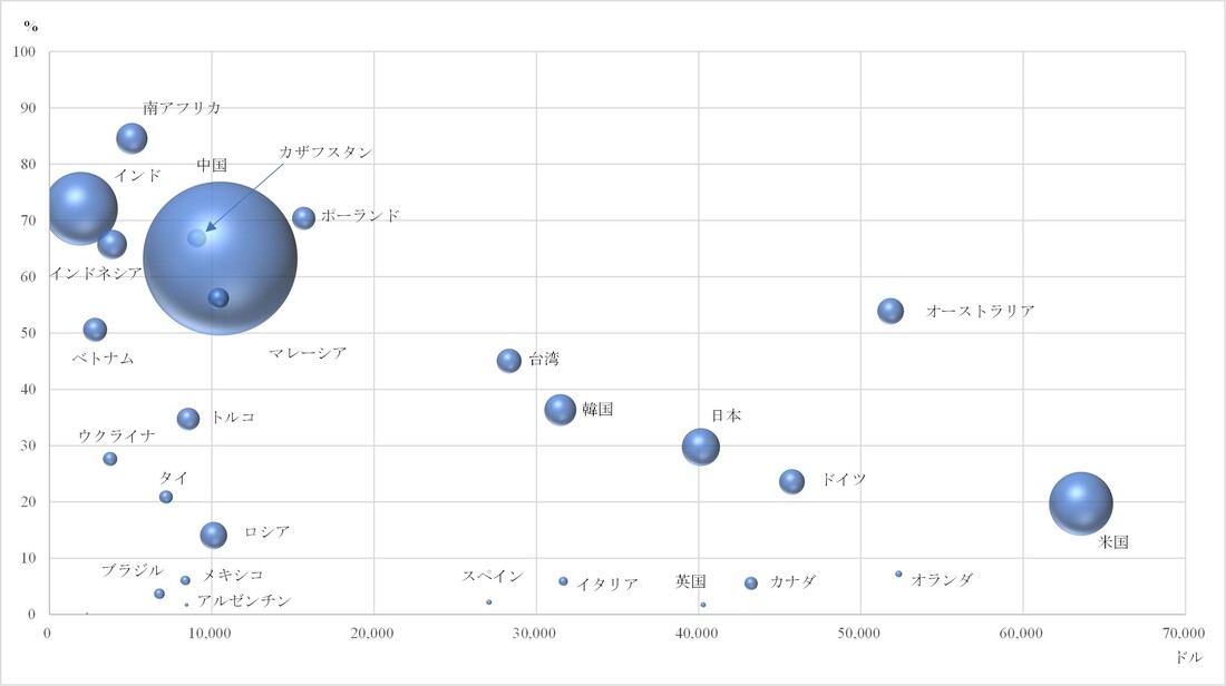 以上を踏まえた上で、COP26で槍玉に挙げられた石炭火力の役割について再検討してみたい。図は石炭で発電している世界の国々について、石炭火力への依存度とその発電量、それと豊かさの指標である一人当たりGDPとの関係を示している。石炭火力による発電量・依存度が高い国々は図の左側、すなわち経済発展途上段階に多く存在している。途上国にとって石炭火力の優れた経済性は魅力的に映って当然で、エネルギーコストを節約して浮いた資金を投資に回すことが出来ればそれだけ早い経済発展が可能になる。未だ経済発展の端緒をつかんでいないような国々はアジアにもアフリカにも数多く存在しており、そうした国々はまだ電力需要が小さいためこの図に載っていないが、将来的に石炭火力の優れた経済性を享受する権利がある点も忘れてはならない。