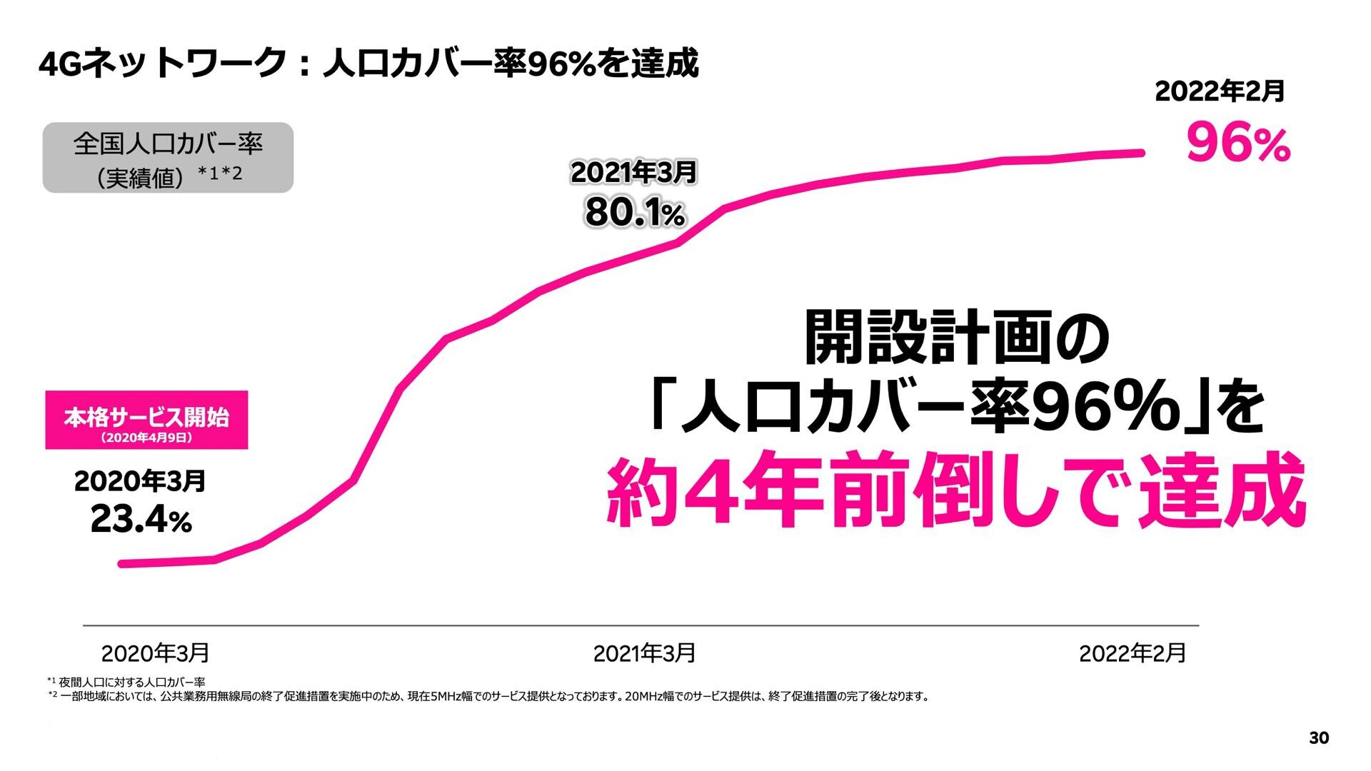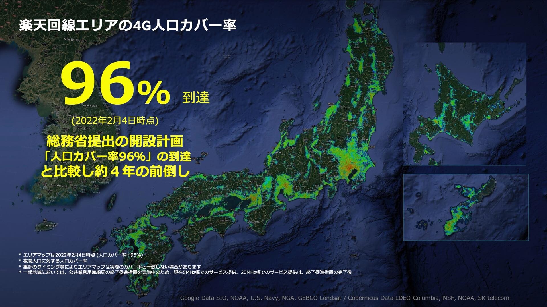 楽天モバイルでは2020年4月にMNOによる携帯電話サービスを正式に開始し、サービス開始時点での日本全国の人口カバー率は23.4%でしたが、その後、総務省に提出した基地局開設計画を前倒ししてエリア展開を急ピッチで拡大し、2021年3月には80.1%、そしてすでに[https://s-max.jp/archives/1813400.html[発表]]があったように2月4日に2026年度末に予定していた96%に約4年前倒しで到達しました。