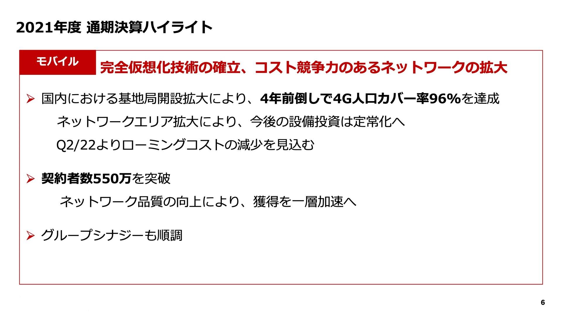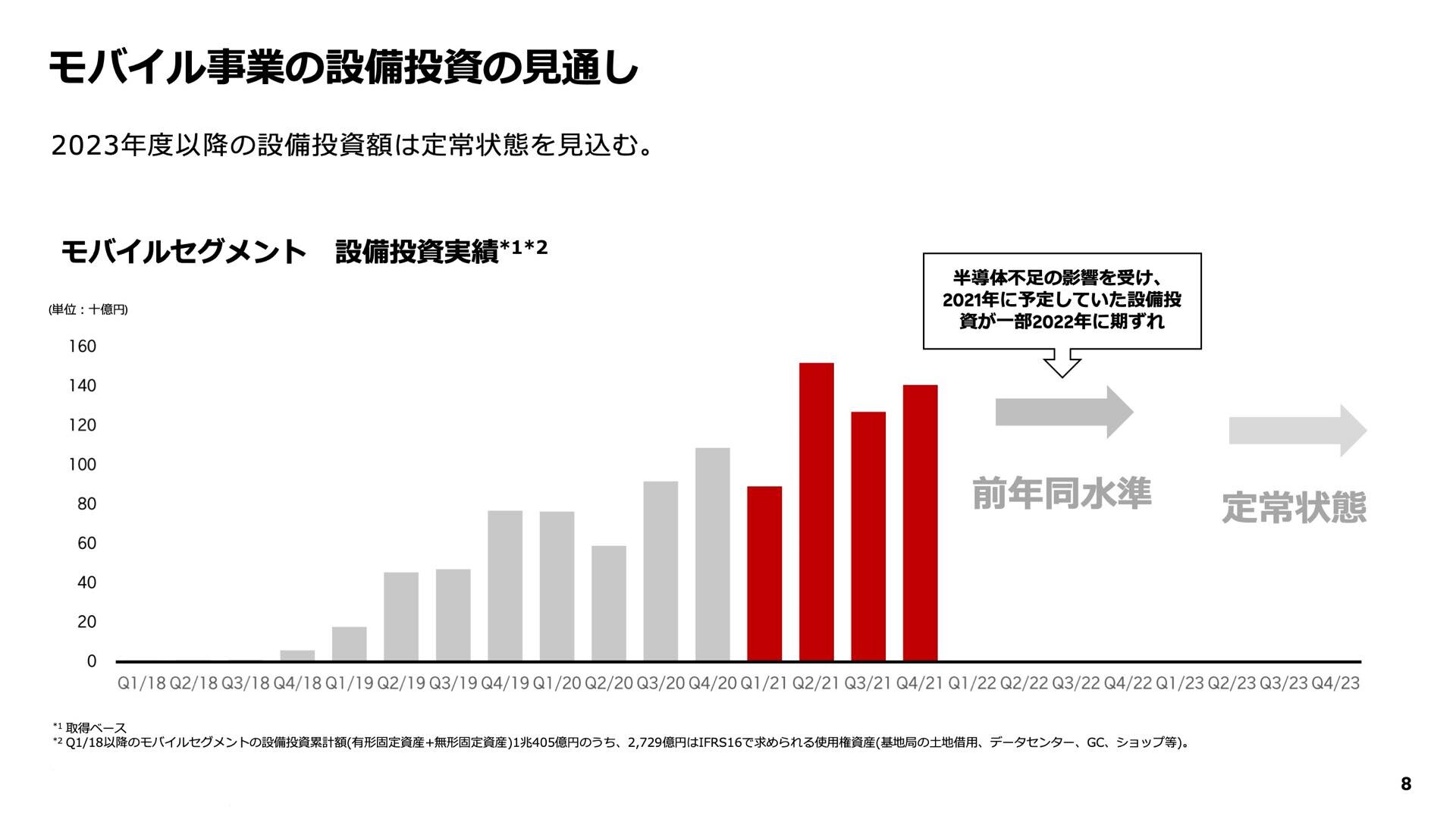 またMNP手数料や解約手数料などの手数料撤廃やキャリアメール持ち運び制度の開始などの競争環境の改善とネットワーク構築状況の改善によって契約者獲得がさらに加速される計画だとのこと。なお、設備投資については半導体不足の影響から一部が2022年度にずれ込むこともあり、2022年度は引き続いて前年度と同水準となるものの、2023年度以降は定常化するということです。