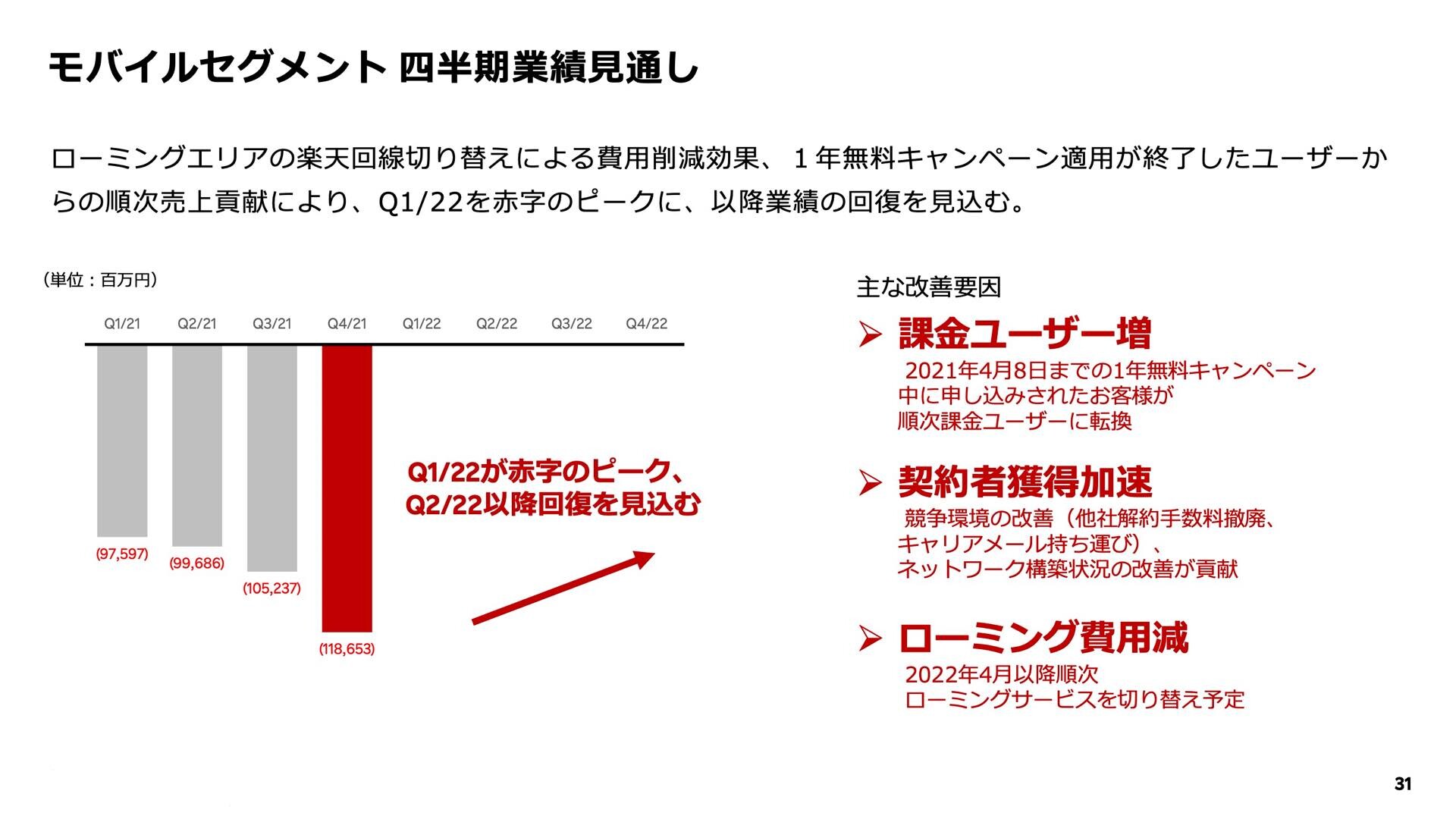 こうしたことに加え、2021年4月8日まで実施していた1年無料キャンペーンの対象者が順次課金対象となっていくほか、au回線エリアのローミング費用も2022年4月以降は減少する見込みであることから2022年第1四半期が赤字のピークとなり、2022年第2四半期以降は業績回復を見込んでいるということです。