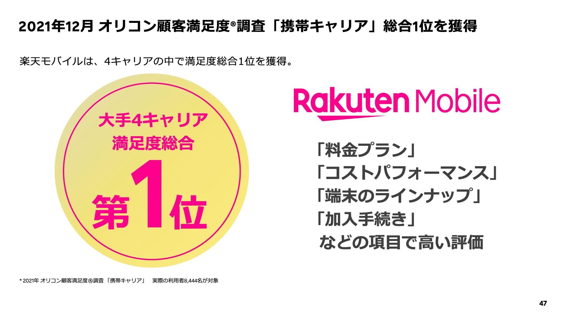 なお、2021年12月にオリコンが発表した顧客満足度調査において「携帯キャリア」部門で楽天モバイルが総合1位になったとのこと。特に料金プランやコストパフォーマンス、端末のラインナップ、加入手続きなどの項目で高い評価となっています。