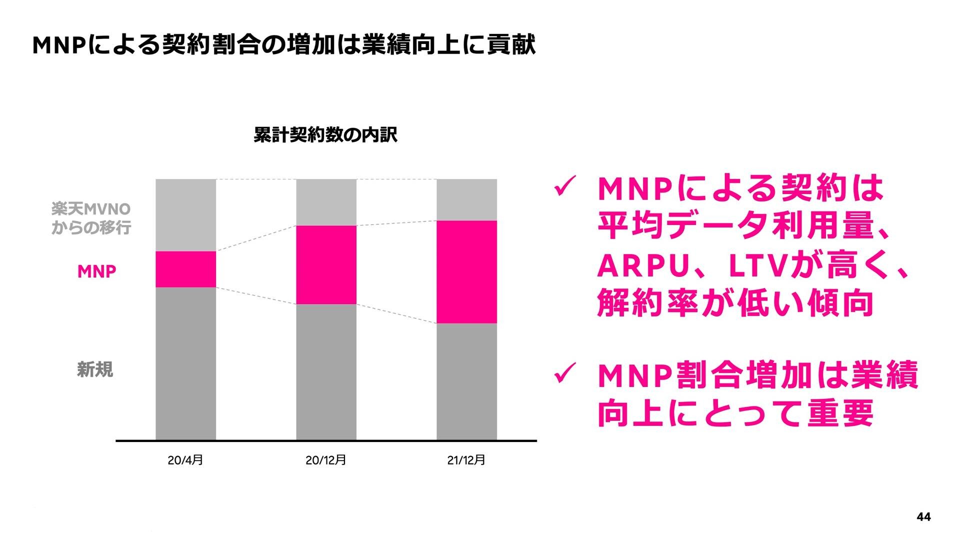 特に他社から乗り換え(MNP)の割合が少しずつ増加しており、2021年12月時点では4割近くとなっているほか、MNPで契約した人は平均データ利用量も多く、ARPUやLTVが高く、さらに解約率も低い傾向にあるとし、同社ではMNPによる契約割合の増加が業績向上に貢献しているとしています。