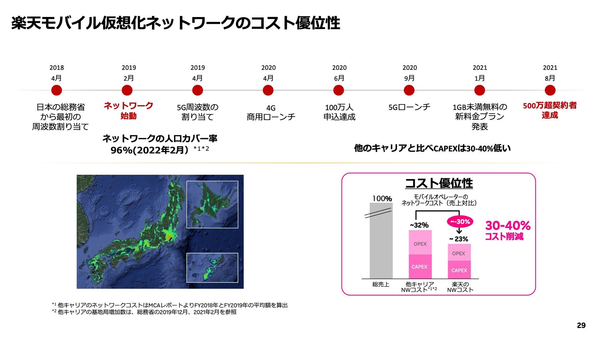 こうしたエリア展開の急拡大においても世界初の完全仮想化ネットワークであることが優位となっているとのこと。また当初から説明されているコスト的な優位性も実際に実現され、売上に対するネットワークコストも他社が~32%であるのに対し、同社では~23%と30~40%もコストを削減できているとしています。