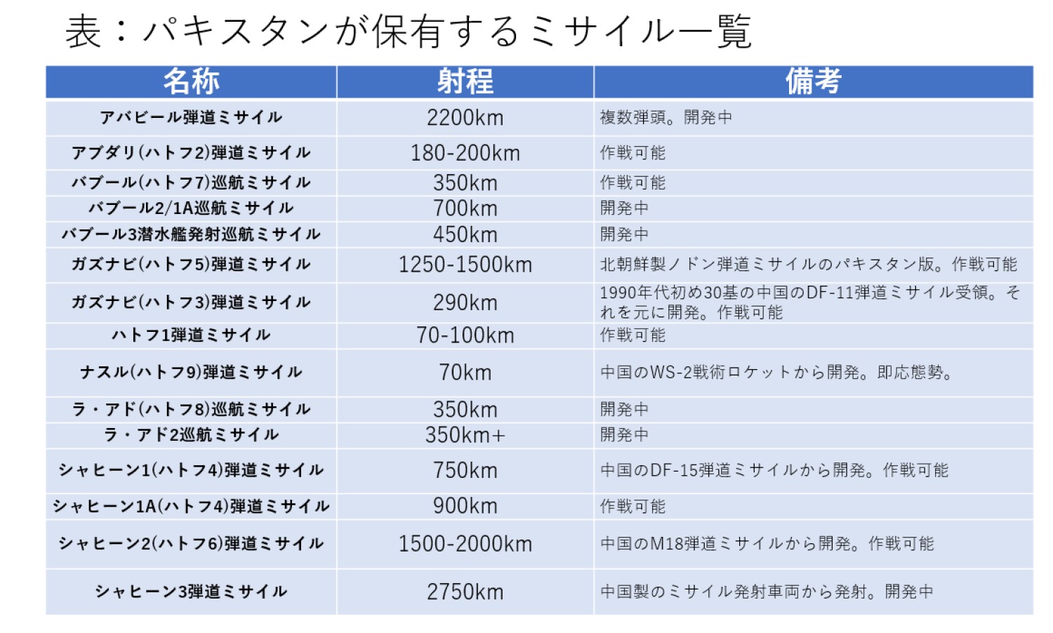 実は中国は過去、パキスタンのミサイル開発を継続的に支援してきた。表はパキスタンが保有・開発中のミサイルの一覧である。これをみると、ガズナビ、ナスル、シャヒーンといったミサイルは、中国が開発を支援しているミサイルとみられている。