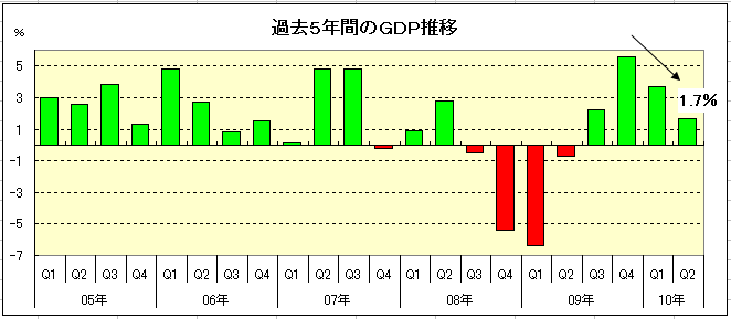 ■商務省が発表した第2四半期(4月〜6月期)の実質国内総生産(GDP)の確定値は、年率換算で前期比1.7%増となった。1ヶ月前に発表された改定値の1.6%増から上方修正された。4四半期連続でプラスとなる一方、2009年10月〜12月期の5.6%増、今年1月〜3月期の3.7%増と成長速度は次第に減速していることが浮き彫りとなった(グラフ参照)。