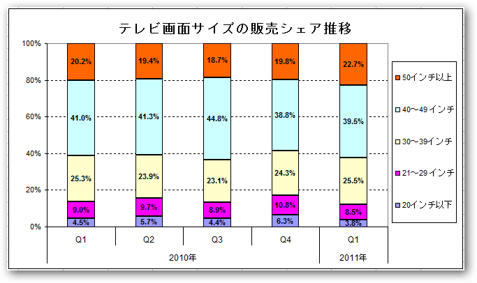 画面サイズのシェア推移グラフ。第1四半期(1月〜3月期)で50インチ以上の大画面テレビが22.7%と空前の人気となった。ただ、最もポピュラーなサイズは全体の4割を占める40インチ〜49インチ、そして30インチ〜39インチだ。価格が安くなっていることに加え、1月〜3月期に大画面サイズが人気となるのは、スーパーボウルが2月にあるからだ。