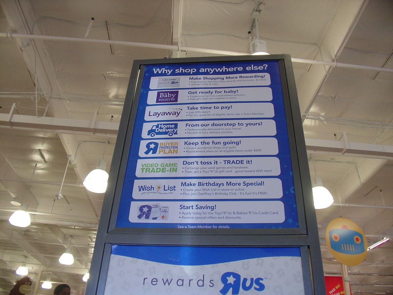 トイザラスに入るとメリットを強調したポップ「なぜトイザラス以外で購入できるのですか?(Why shop anywhere else?)」が目に付く。無料の紙おむつが進呈されるFSPカードの「リワードカード」やお祝い用の「ベビーレジストリー」、おとり置きの「レイアウェイ」、「配達」、「有料延長保証」、TVゲームの「トレードイン」などを差別化にして訴求している。人気玩具をロスリーダーにして集客する競合店を意識しているのだ。