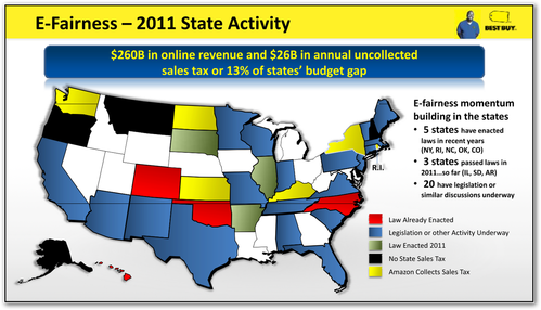 トップ画像:ベストバイの投資家に向けた会議で披露されたプレゼン画像「州別のEフェアネスの実施状況」。Eフェアネスとは、同州内に店や倉庫などの「物理的な所在」をもたないオンラインストアに消費税を徴収させるべストバイの税制運動だ。通称「アマゾン税(Amazon Tax)」と呼ばれている。「アマゾン・コムのショールーム」となっているベストバイは、ロビー活動を通じ「アマゾン税」を導入させることに躍起となっている。