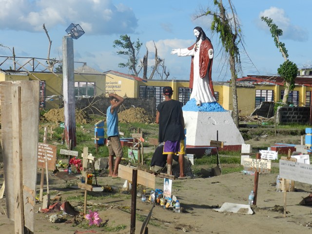 海外の支援で、地区の中心部にある教会の前に、白いテントが区役所として建つ。そして台風で残った大きなキリスト像がある。左手首から先が折れているが、すっくと立っている。キリスト像に守られるように、その周辺に無数の十字架が並ぶ。家族や友人らが、亡き人々のために手作りの墓地や墓標を整えている。