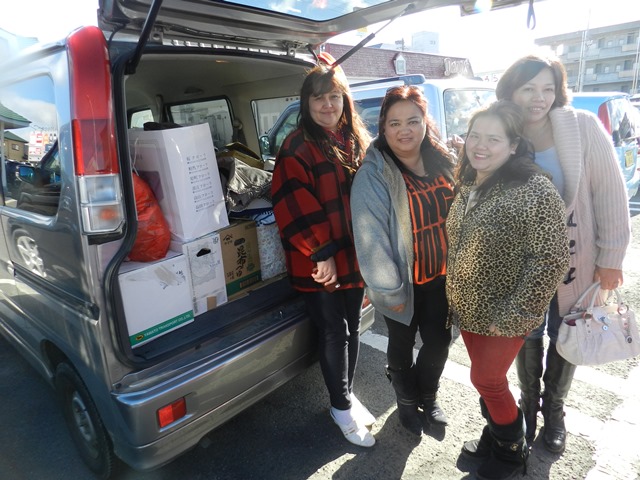「南相馬市で仮設住宅を送る高齢の方から、『新聞で活動を知りました。自分たちも被災者で同じ体験をしているので、フィリピンの被災者をぜひ応援したい』という連絡をもらった時には、本当に感動しました」。そう話すのは、東日本大震災から1ヶ月後の2011年4月に、福島在住のフィリピン人による福島の被災者支援のために活動を開始したグループ「ハワク・カマイ・福島」(手をつなごう福島)を立ち上げた前代表の後藤キャサリンさん(福島市在住25年、フィリピン・ルソン島バタンガス州出身)。リンク先を見るハワク・カマイ・福島のメンバー。左から丹野マリアテレサさん、後藤キャサリンさん、鈴木マイラさん、斎藤ニーダさん。車には福島の被災者から寄せられた物資が積まれている。