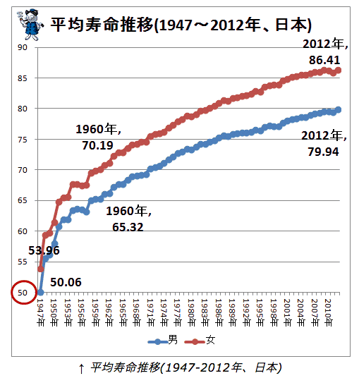 おなじみ、ガベージニュースに日本の平均寿命の推移が掲載されていたので引用させていただきます(日本の平均寿命の推移をグラフ化してみる(2013年)(最新) - ガベージニュース)。