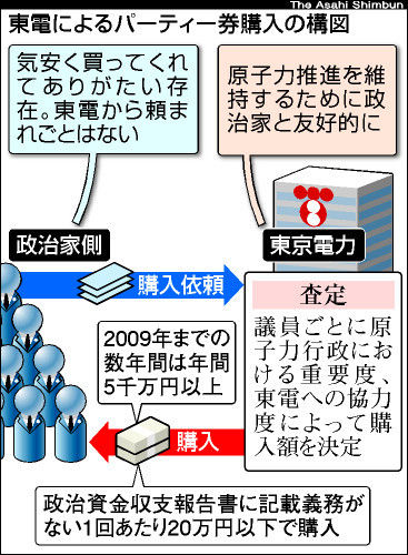 東京電力が2009年までの数年間にわたり、自民党を中心とした50人以上の国会議員のパーティー券などを少なくとも年間計5千万円以上購入していたことが分かった。原子力政策における各議員の重要度や、電力施策への協力度を査定して購入額を決定。1回あたりの購入額を政治資金収支報告書に記載義務がない20万円以下に抑え、表面化しないようにしていた。
