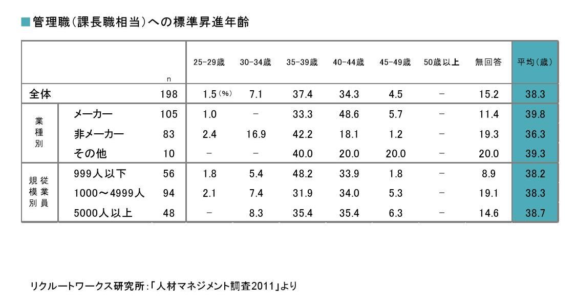 もしバリバリと働いて、ドンドン昇進して例えば管理職に就きたいという女性がいたとしましょう。その際に、管理職昇進の平均年齢は38.3歳ということがわかる、たいへん興味深いデータがあります。