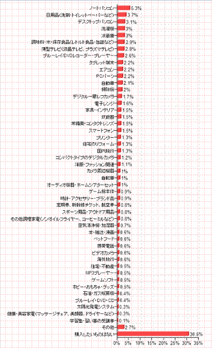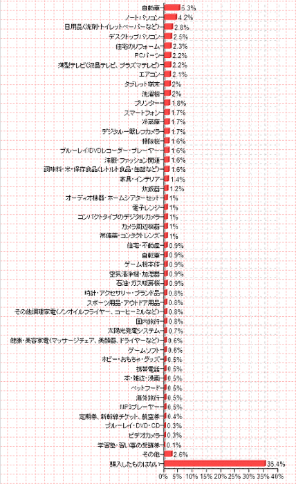 - 消費税率アップを見越して購入したもの: 「車」や「住宅のリフォーム」など高額製品・サービスに高い需要
