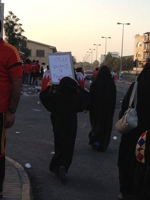 リンク先を見るバハレーンのデモ行進では、アバーヤは安全確保に役立つ(2013年3月、バハレーンにて筆者撮影)