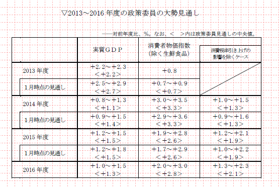 画像を見る最後に、日銀金融政策決定会合にて議論された「展望リポート」の p.10 で2013-2016年度の政策委員の大勢見通しは、上の通り明らかにされました。追加緩和は見送られたようですが、2015年度に消費者物価上昇率が2%に達するとの基本シナリオは維持されたと受け止めています。