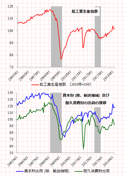 いずれもとてもよく取りまとめられた記事だという気がします。次に、鉱工業生産と出荷のグラフは以下の通りです。上のパネルは2010年=100となる鉱工業生産指数そのもの、下は輸送機械を除く資本財出荷と耐久消費財出荷です。いずれも季節調整済みの系列であり、影を付けた部分は景気後退期です。なお、毎度のお断りですが、このブログのローカル・ルールで、直近の景気の谷は2012年11月であったと仮置きしています。これは、毎月勤労統計の所定外労働時間指数のグラフも同じです。