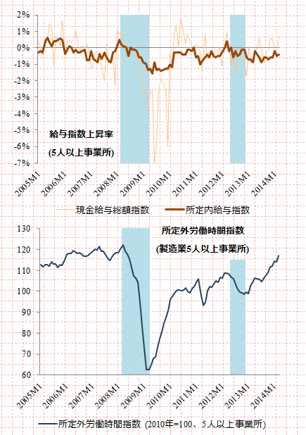 期末手当やボーナスなど特別に支払われた給与は14.8%増えた。残業代などの所定外給与は4.8%増えた。所定外労働時間は7.4%増と10年9月(8.7%増)以来3年6カ月ぶりの高い伸びとなった。増加は10カ月連続。このうち製造業は12.7%増と9カ月連続で増えた。消費増税前の駆け込み需要などで生産活動が活発化したことを映した。