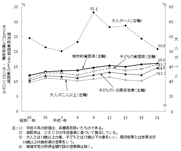 「相対的貧困率」という耳慣れない言葉については、ここら辺がわかりやすいです。平成21年の貧困線(等価可処分所得の中央値の半分)は 112万円(実質値)となっており、「相対的貧困率」(貧困線に満たない世帯員の割合)は 16.0%となっている。また、「子どもの貧困率」(17歳以下)は 15.7%となっている。