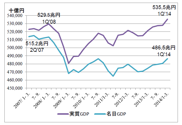 5月15日には1-3月期のGDP速報値が発表された。年率で5.9%という高い伸びを示しているので、これでようやく実額ベースでリーマン前の水準を超えることができた。名目GDPも、ここへ来て6四半期連続の伸びを示している。○GDP(実額)の推移 画像を見る