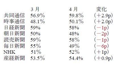 結果は下記の通り。毎日新聞だけがやや「異常値」になっているものの、全体は「4勝4敗」で有意な変化は読み取ることができなかった。ということは、「民意は消費税増税にさほど影響を受けていない」という結論を導き出すことができる。