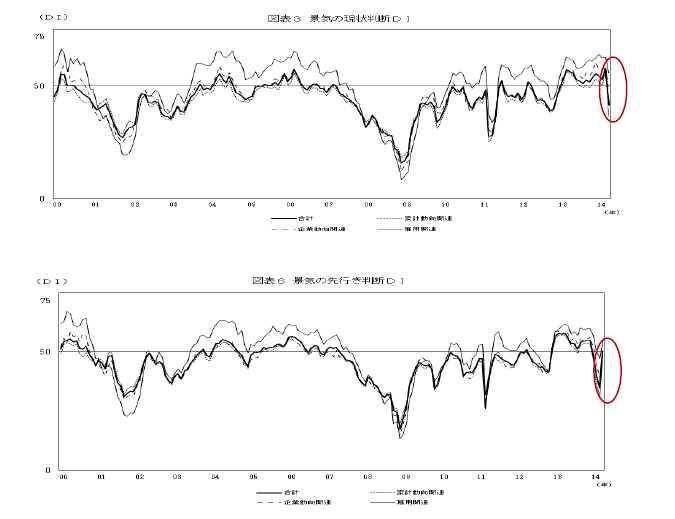 個人的にありがたみを感じたのは、ホンモノの「景気ウォッチャー調査」(4月分)である。3月の同調査は、「現状判断は過去最高水準、先行き判断は大震災以来の低水準」だった。つまり「駆け込み需要で足元は良いけれども、先行き(3か月先)は悪い」という見通しだ。ところがどの程度悪く、どれくらい長期化するかが読み取れない。なにしろこの調査は2000年からで、過去に「増税局面」を経験したことがないのである。