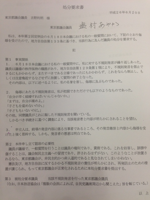 今朝9時、ご報告通り塩村あやか議員が「処分要求」を公式に提出いたしました。