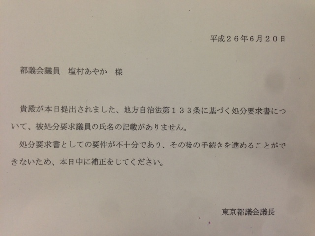 やはり、被処分要求議員の記載がない(対象が特定されていない)という理由で、「本日中に補正」が求められる形での差し戻しです。
