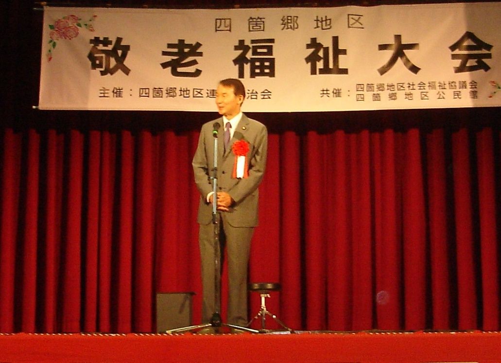 (年金で暮らす皆さんが集まる敬老福祉大会であいさつする岸本周平。)