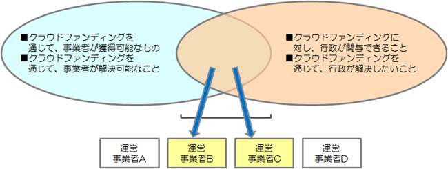その場合、「クラウドファンディングを通じて獲得可能なこと/解決可能なこと」と「クラウドファンディングを通じて行政が解決したいこと」の調整を図り、行政関与型のクラウドファンディング事業の目指すべき形を明確にした上で、その実現に最も適した連携パートナーを抽出し、具体の実施体制のあり方を検討・構築することが求められよう。