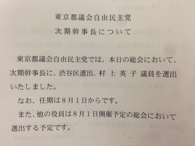 本日、都議会自民党(東京都議会自由民主党)の幹事長に村上英子議員が選出されることが発表されました。任期は8月1日からとなります。