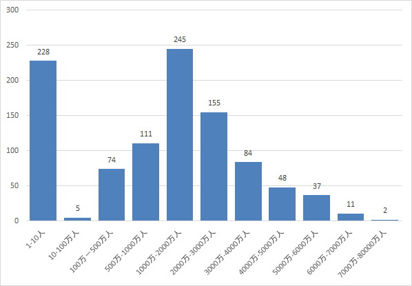 試行回数が1000回とそれほど多くないこともあり、1000万~2000万人の範囲が最も頻度が高くなった。一方で、1~10人の範囲も228回と20%を超える回数で発生しており、少ない人数でイベントが終わることも決して少なくないことが分かる。