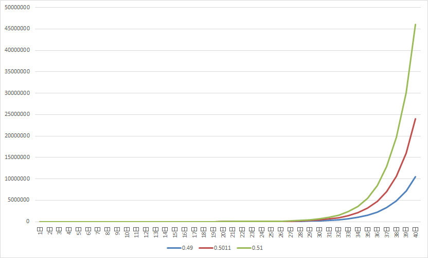 グラフで確認すると、指数的にチャレンジ人数が増加していくことが一目でわかる。グラフには、参考としてチャレンジする確率が、0.49、及び0.51の場合もプロットしたが、確率が0.01上下するだけで、40日目のチャレンジ人数が1000万人単位で変化することも興味深い結果だ。