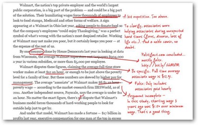 トップ画像:ニューヨークタイムズ紙の論評を赤ペンで添削したウォルマートのブログ「事実のチェック(Fact Check)」。記事のトップには「ティム、(記事になる前の)最初の下書きを共有してくれてありがとう!以下は、通常なら記事にできないような誤りを正したものです。気に入ってくれれば幸いです」と皮肉を込めて書かれている。本文では問題となる部分に下線を引き、注釈をつけるように右側に誤りを指摘している。ここまでするウォルマートには高い評価が集まった。