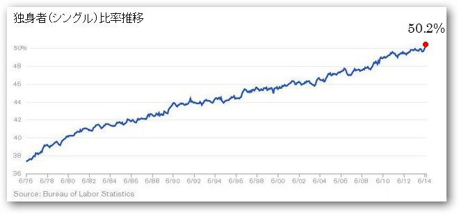 ■労働統計局の雇用統計に使われるデータによると、独身者(シングル)の比率が既婚者を初めて上回った。8月の統計では、16歳以上の米国人約1億2,460万人のうち50.2%がシングルの比率となった。統計が始まった1976年でのシングル比率は、37.4%だった。一度も結婚したことがないシングル比率は1976年の22.1%から30.4%に上昇しており、離婚や死別などでシングルとなっている人も15.3%から19.8%と増えている。最もシングル比率が高い州はルイジアナ州(55.7%)、ロードアイランド州(55.7%)、ニューヨーク(55.4%)、ミシシッピー州(54.9%)、ニューメキシコ州(53.6%)となっており、逆にシングル比率が低い州はユタ州(43.7%)、アイダホ州(44.4%)、ワイオミング州(46.4%)、アイオア州(46.7%)、ネブラスカ州(46.9%)となっている。都市部でシングル比率の高いのはニューオーリンズ(58%)、メンフィス(57.7%)、マイアミ(56.7%)、ロサンゼルス(55.8%)、バッフォロー(55.1%)となり、シングル比率の低い都市はサンノゼ(47.1%)、ソルトレイクシティ(47.3%)、ノースカロライナ州ローリー(47.8%)、ミネアポリス(48.7%)、カンサスシティ(49.1%)の順となっている。