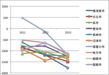 2013年転出超過ワースト3は、横須賀市、日立市、呉市